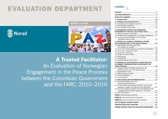 Norge var, sammen med Cuba, tilrettelegger i fredsprosessen mellom de colombianske myndighetene og FARC fra juni 2010 til desember 2016. Evalueringen dokumenterer og analyserer Norges rolle og bidrag i fredsprosessen. Den vurderer ikke resultatene av prosessen og implementeringen av fredsavtalen.